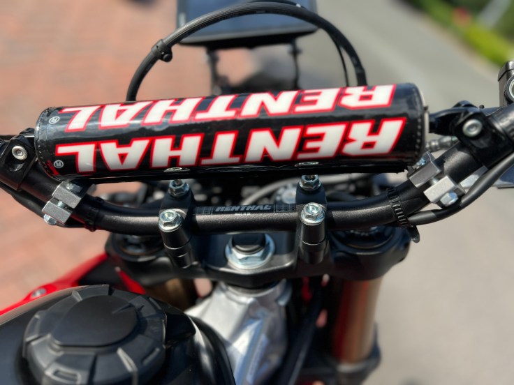 To handle demanding trails and unexpected obstacles, I have the CRF equipped with Rental bars and Bark Busters. This combination not only provides extra protection for the handlebars and controls but also enhances the bike’s overall durability, even during the most challenging rides.