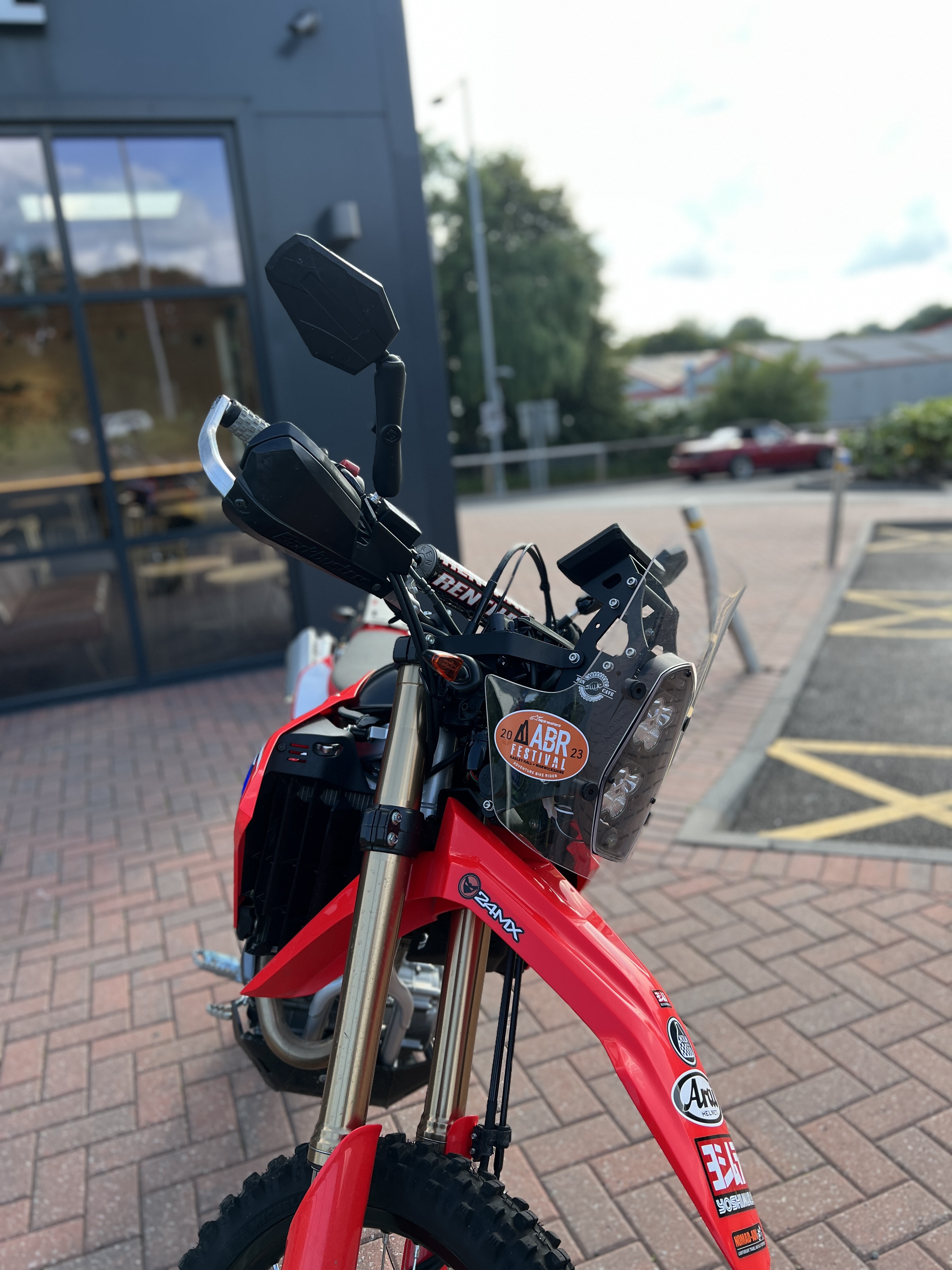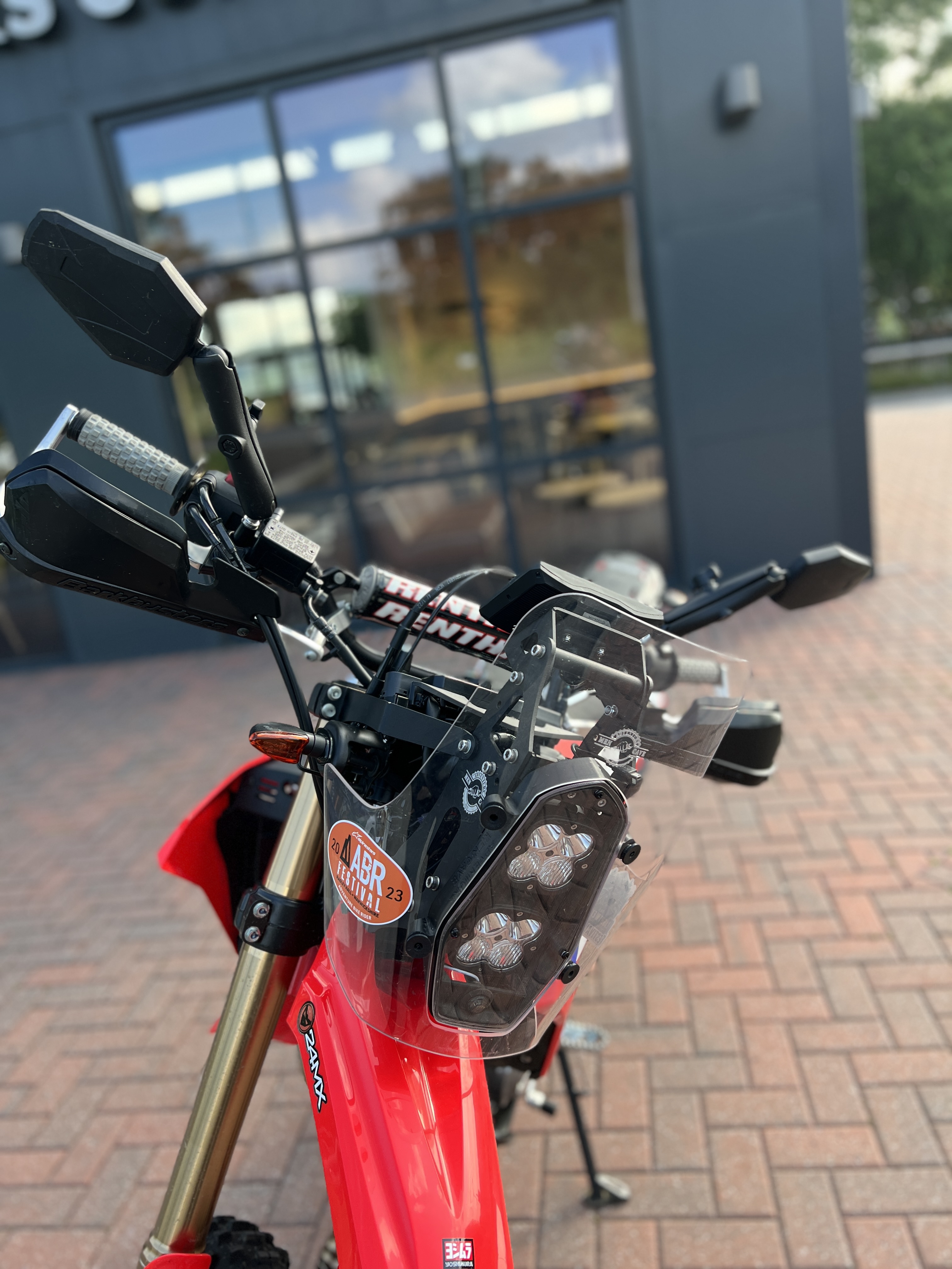 Off-road riding and the inevitable dropping of your bike can take its toll on things like mirrors. Double-Take mirrors proved to be the ideal solution for the CRF, firstly, you can fold them in when not required, but when mirrors are needed, their durability and adjustable design ensure they stay in place despite rough conditions, providing a clear view of the surroundings at all times.