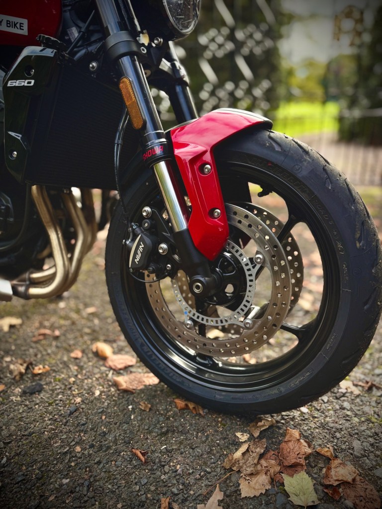 The 2025 Trident 660 has upgraded suspension – with the Showa forks offering confidence when pressing on, without sacrificing comfort. It’s firm enough to feel planted, but never harsh.
