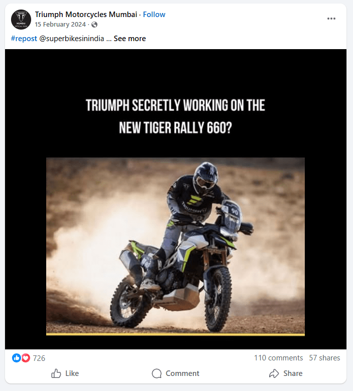 Now, to be clear: as I write this there is no Triumph Tiger 660 Rally currently in production. I even asked on the Triumph stand at MCL this year, but no information was forthcoming. But if you’ve spent time wandering the corners of the motorcycling internet, you may have seen the rumours. Back in February 2024, Triumph Motorcycles Mumbai shared a Facebook post that set forums and social media buzzing with speculation.