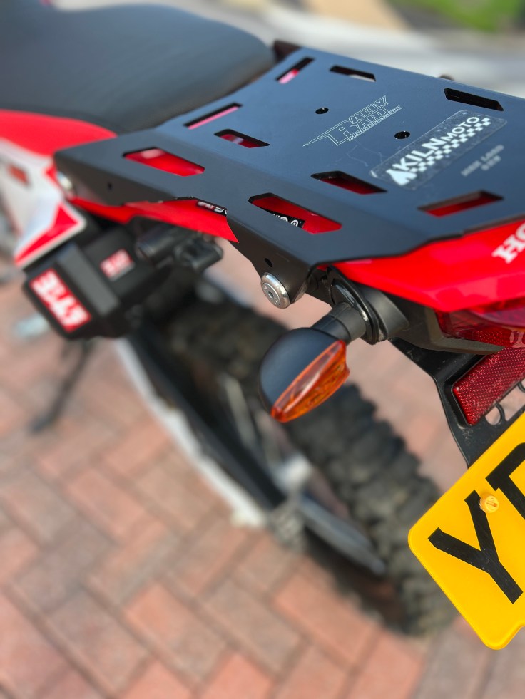 Equipping my CRF for extended off-road jaunts, I needed some storage, the Rally Raid rack offers secure base for all my essential gear, such as bags and panniers.
