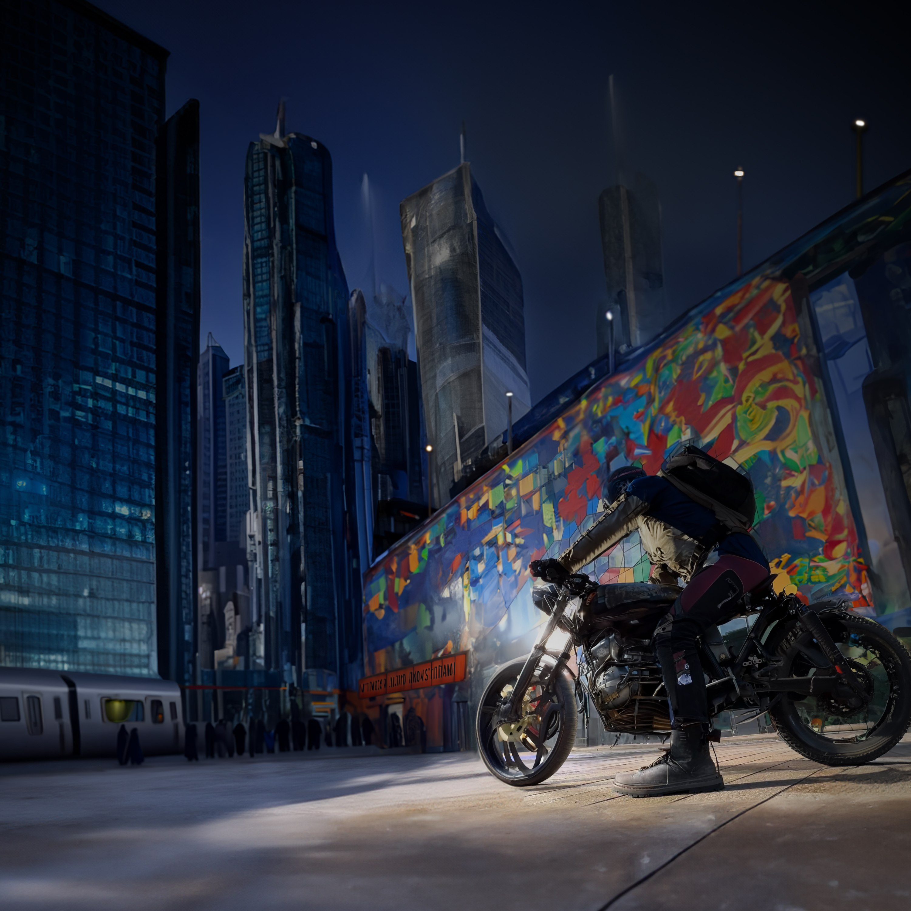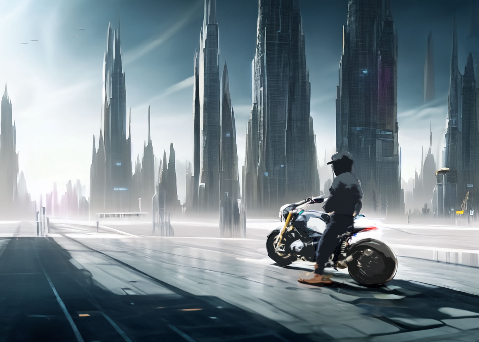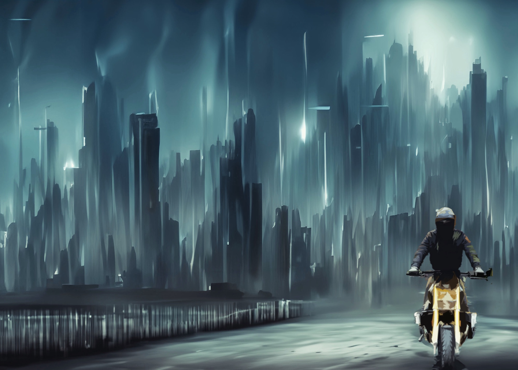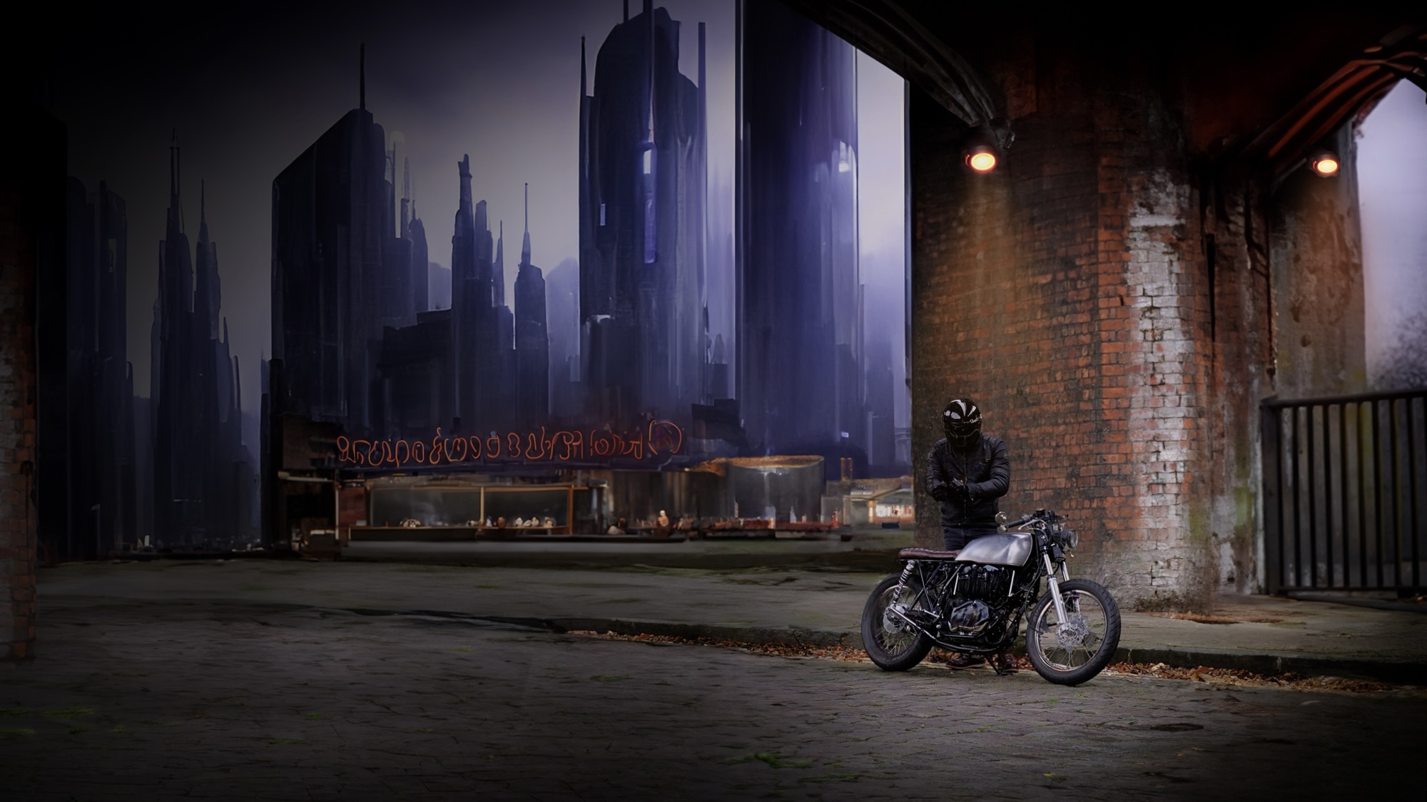 Welcome to a small collection of my motorcycle digital art, where reality merges with visions of a dystopian future filled with sleek machines and stark cityscapes. Many of these pieces are inspired by photos of my own bikes, including my CB750 café racer and my old BMW R9T.